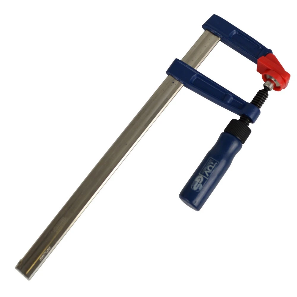 Profi Schraubzwinge von GERMANIA, in vier Spanbereichen von 1000 x 120 mm. Die Schraubzwinge hat eine geriffelte, verzinkte Profilschiene, Kunststoff-Schutzbacken und einen hölzernen Griff, blau lackiert.